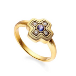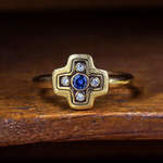 This Alex Sepkus ring features a round Blue Sapphire in the center accented by 4 round Diamonds. The stones are set into an 18k Yellow Gold squared cross design with the signature blackened detailing we often see with a Sepkus original. The remainder of the cross is adorned with textured detailing and sits on a classic gold band.