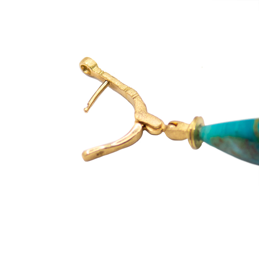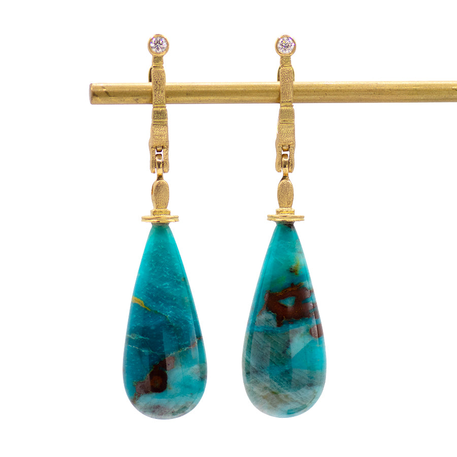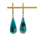 One-of-a-kind by Alex Sepkus, these blue beauties have the most captivating hues! The iconic "Stick and Stones" setting is created in 18k Yellow Gold and features a single bezel-set round Diamond that sits above the post, allowing it to lay perfectly on the ear. The setting leads down to an 18k Gold drop holding a single teardrop-shaped Blue Copper Wood Opal. Rare and absolutely exquisite, these are sure to turn heads!