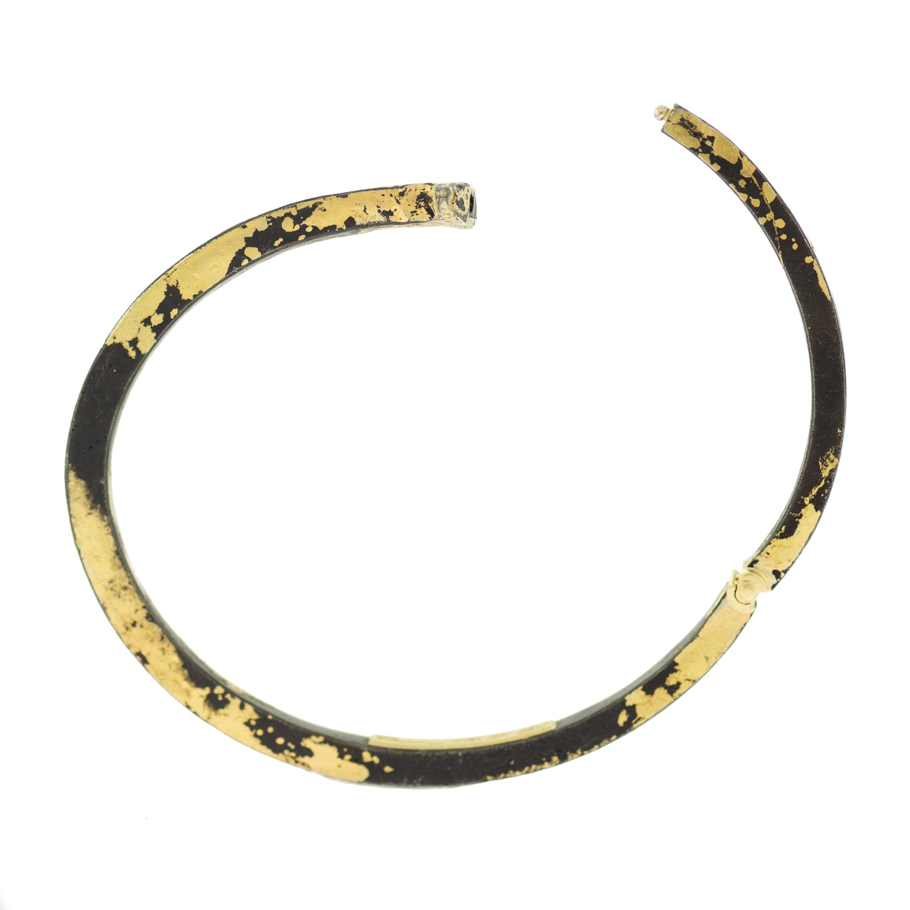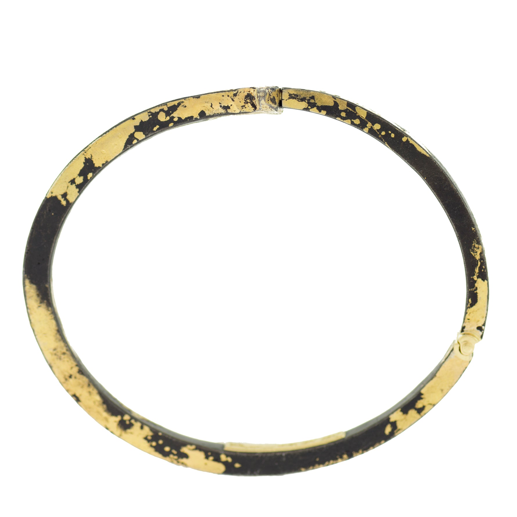 This Pat Flynn bracelet features a high contrast, unique look! A blackened steel nail is hand-forged and dusted with 22K Yellow Gold. The piece opens with a hand-crafted hidden closure and 18K Yellow Gold hinge. You'll love how this looks on any skin tone!