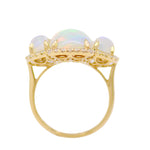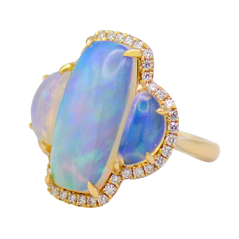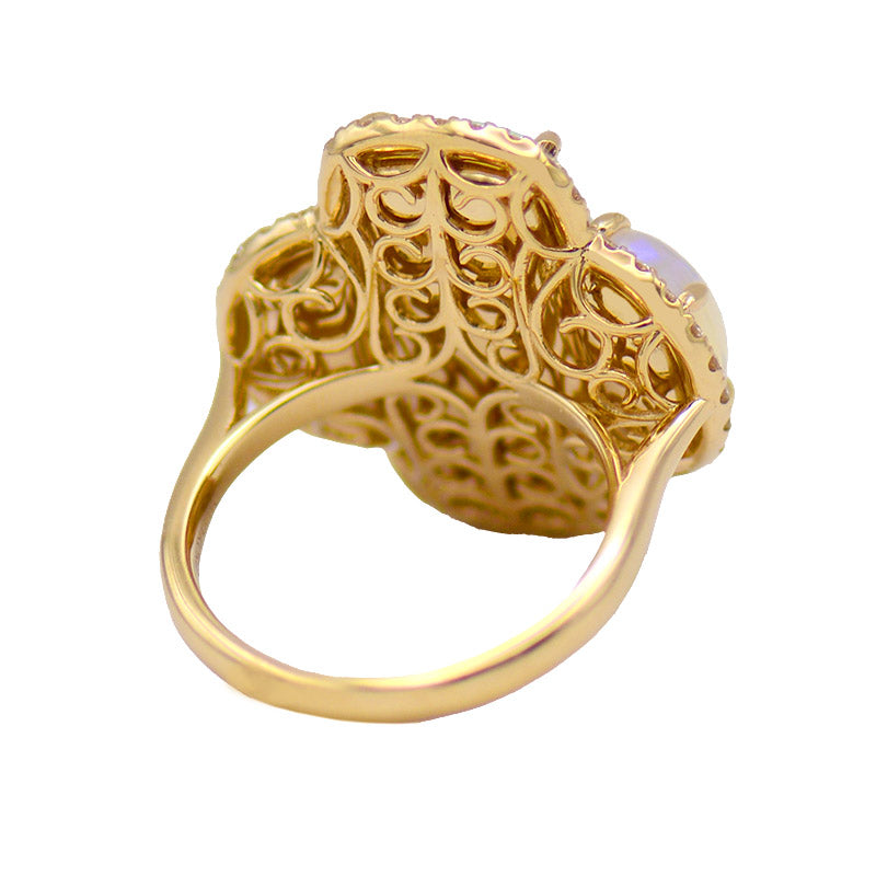 The kind of ring that will have heads turning in every room you walk into!! An elongated cushion-shaped Opal is accented with a half-moon Opal on each side. The gemstones are surrounded by a halo of round Diamonds, accenting the brilliance of the stunning Opals. The entire ring is crafted in 18k Yellow Gold with an exquisite open filagree gallery underneath. Jaw-dropping.