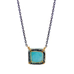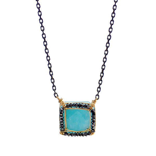 A square Amazonite pendant is framed with Black Diamonds, wire wrapped by hand with gold wire that brings a pop of warmth to the piece! The wire wrapping continues to the chain, connecting the pendant to the Oxidized Sterling Silver cable chain that mirrors the black of the Diamonds beautifully. One-of-a-kind and perfect for any occasion!