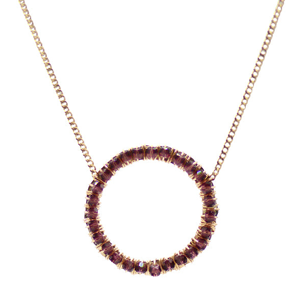 A single row of faceted Amethyst stones are wire-wrapped by hand onto the front of a gold filled open circle pendant. The wire-wrapping is a signature of Dana Kellin's brand! The pendant is fixed in the center of a gold filled chain with a lobster clasp. Wear it alone or layer it with your other favorite pieces!