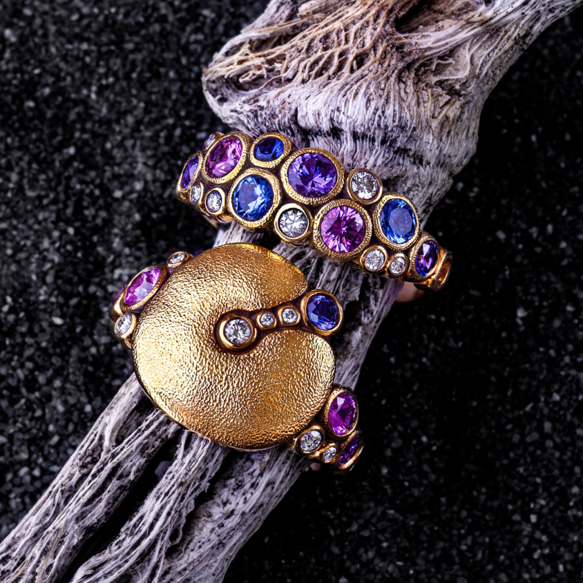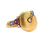 Possibly one of our favorite Alex Sepkus rings ever! Crafted in 18k Yellow Gold, the "Apple" Ring features a large organic circle shape in the center with hand-engraved textured detailing. There is a round bezel set Diamond in the center that leads to two smaller Diamonds and a single Sapphire. Leaving down the band you'll find 2 Sapphires on each side accented by 2 round Diamonds. With Sapphire colors ranging from blue to purple to pink - this piece is exquisite!