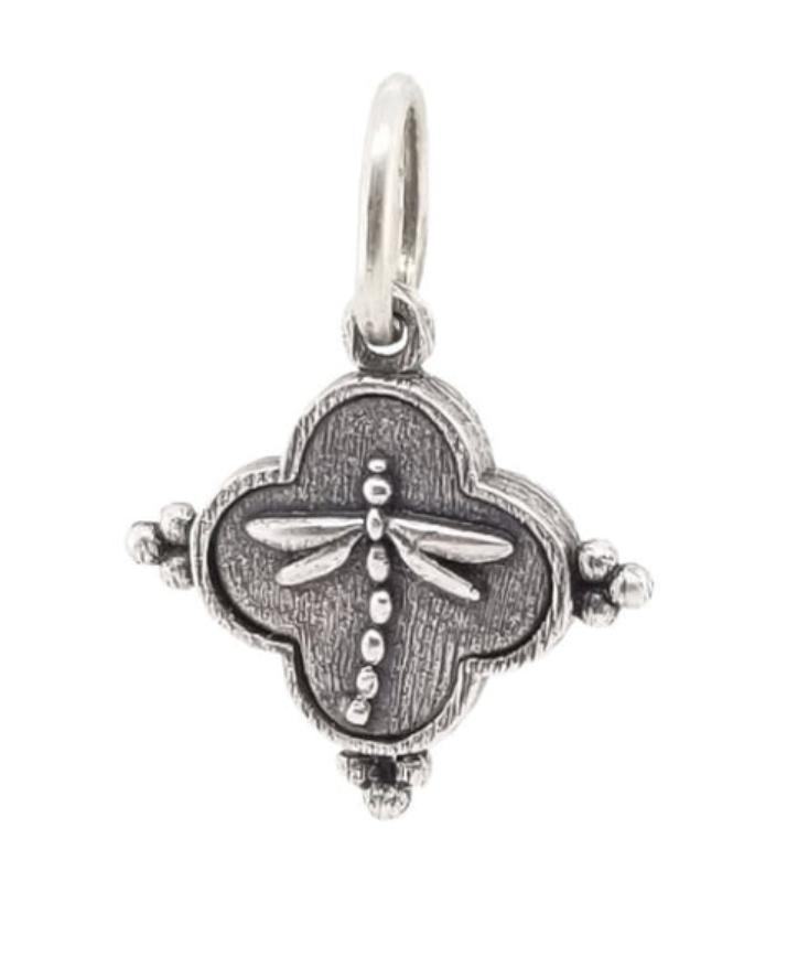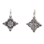 Part of our collection of iconic charms by Erica Molinari! A small double-sided charm is crafted in Oxidized Sterling Silver. One side of the charm features an antiqued flower while the other is crafted with a raised dragonly design! A perfect everyday piece or addition to a set of charms!