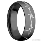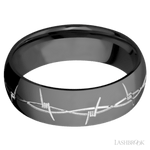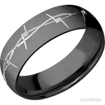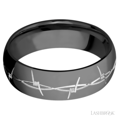 A truly unique ring by Lashbrook Designs...and so comfortable! A 7mm wide domed Zirconium band with a machined Barb Wire pattern in a silver tone. You won't see many bands like this one!