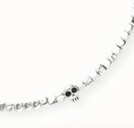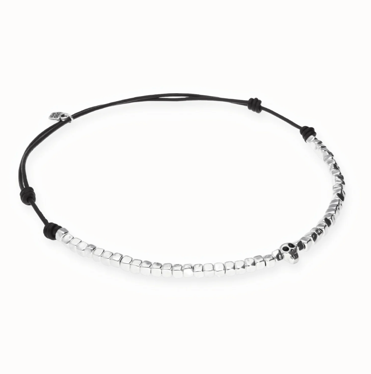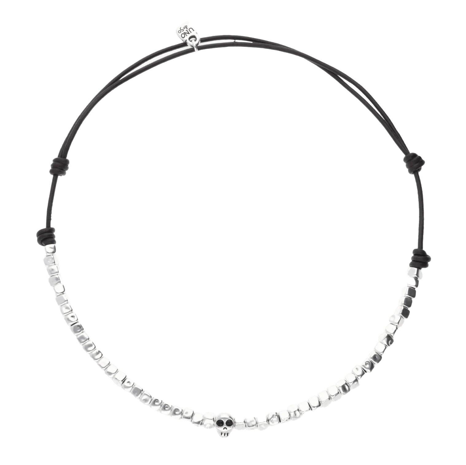 Unique and edgy necklace by UNOde50! A small skull pendant is strung in the center of silver-plated beads that make up the front half of this piece. The back half of the necklace is crafted in dark brown leather cord that slides with slip knots to get the perfect length!