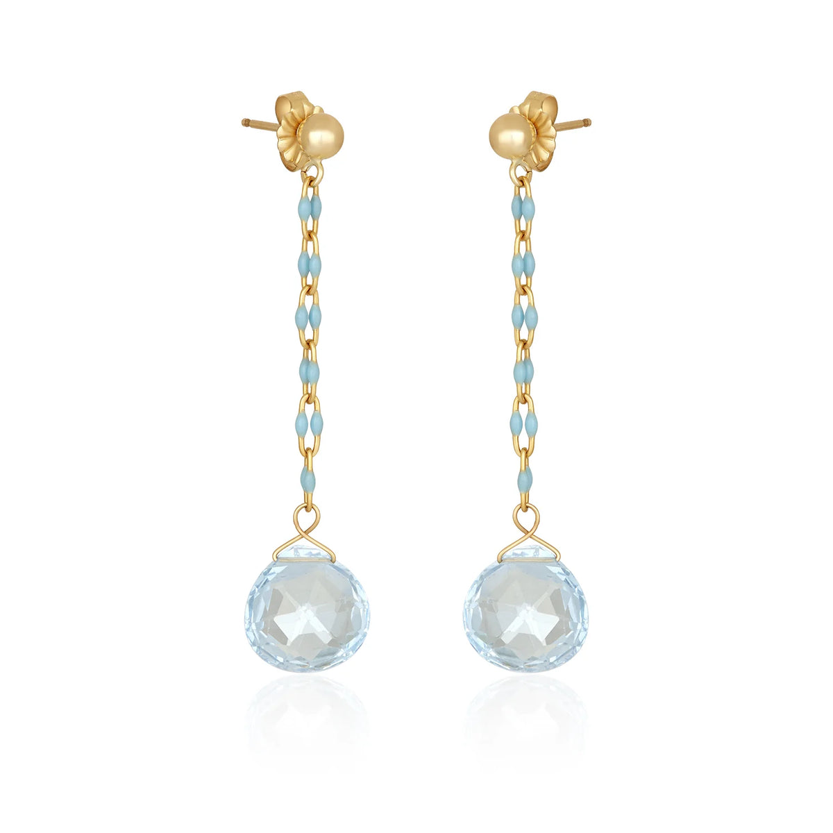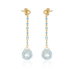 Simple & sweet with the perfect color & sparkle! Mabel Chong designed these earrings each with a faceted pear-shaped Blue Topaz drop that hangs from a 14k gold filled chain accented by Turquoise Enamel. The drop hangs from a gold filled ball stud with a classic post/nut backing.