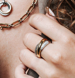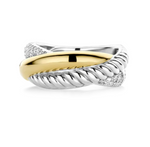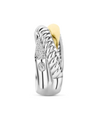 A braided statement ring by TI SENTO - Milano! The ring is designed with 3 bands; one high-polished gold plated, one with a braided sterling silver pattern, and one sterling silver set with Zirconia stones. The bands twist over each other across the top of the ring for a unique, bold design!
