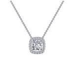 Timeless elegance. This halo necklace features Lafonn's signature Lassaire cushion-cut and round simulated diamonds in sterling silver bonded with platinum. The center stone is prong set, surrounded by a round halo. With an adjustable chain, it's perfect for any outfit!