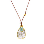 We love a unique necklace! Margaret Solow created this necklace with a unique oval-shaped Diamond slide wrapped in a thin 18k Yellow Gold bezel and hangs from a round bail. Hanging in front of the Diamond, also framed in gold, is a smaller Emerald stone that brings a gorgeous green hue to the necklace. The pendant is tied onto Margaret's signature dark brown nylon cord and features both a yellow gold bead accent and lobster clasp. The unique characteristics of the Diamond will have you falling in love!