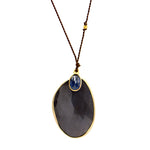 Calling all Sapphire lovers! Margaret Solow has made the perfect piece for you! A small faceted blue Sapphire is wrapped in a thin 18k Yellow Gold bezel and hangs from a round bail in front of a larger, dark grey Sapphire. The pendant is tied onto Margaret's signature dark brown nylon cord and features both a yellow gold bead accent and lobster clasp. Such a unique color combo, we love it!