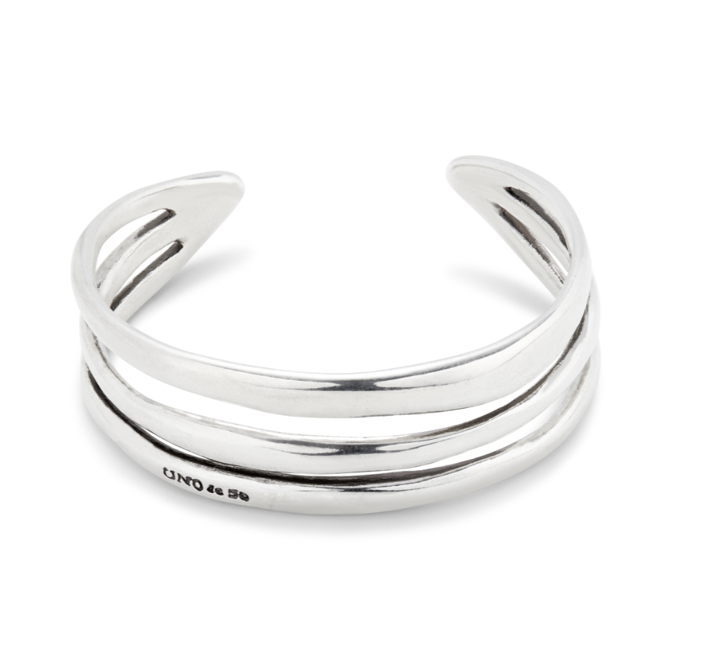 Handcrafted in Spain, this UNOde50 bracelet is one of our favorites! 3 rows of high-polished silver-plated metal run parallel to each other, tapering off at the base of the wrist for maximum comfort. Bold and beautiful!