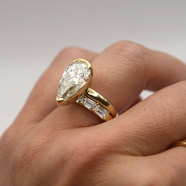 Stack it, wear it alone, or as a wedding band! This Ava Couture ring is crafted with emerald cut lab-gown diamonds set east/west in 14k Yellow Gold. The ring was designed with stones along the top half, leaving plenty of space for sizing and keeping maximum comfort!
