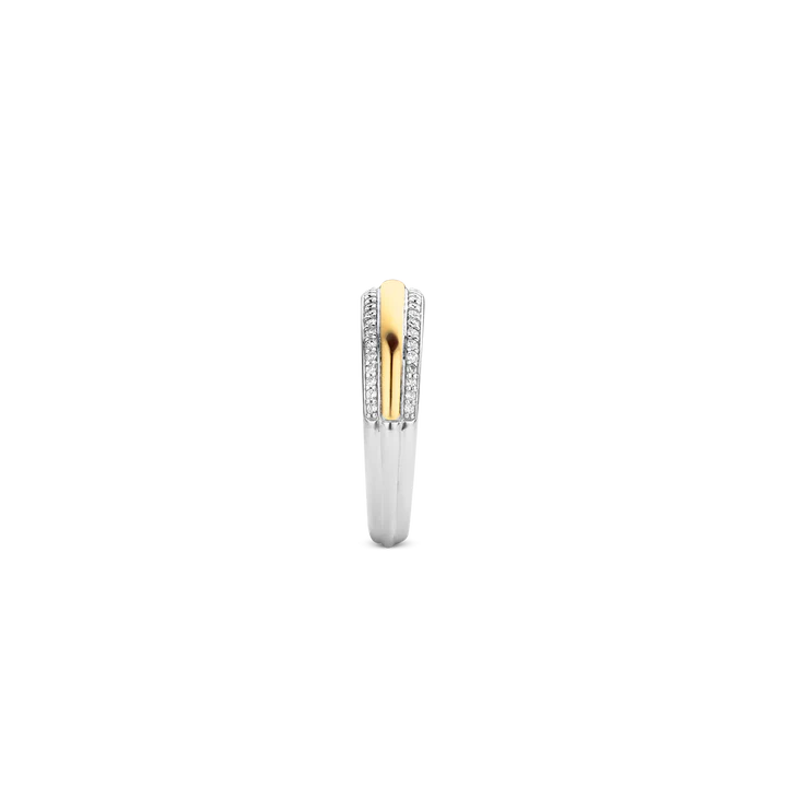 An 18k Yellow Gold Plated, high-polished band sits between two rows of sparkling Zirconia stones in this TI SENTO - Milano ring! The Sterling Silver base gives a gorgeous two-toned look to the piece that we love!