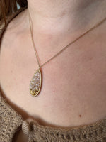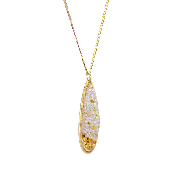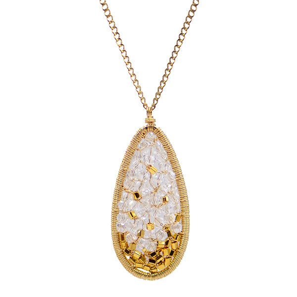 A classic example of the intricate work of Dana Kellin! A pear-shaped pendant crafted in 14k gold-filled wire features white crystals that turn to gold-filled beads along the base. Each piece is meticulously wire-wrapped by hand onto the piece in it's exact right spot! Hanging from a 14k gold-filled chain, this is the perfect sparkling pendant for any outfit!