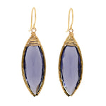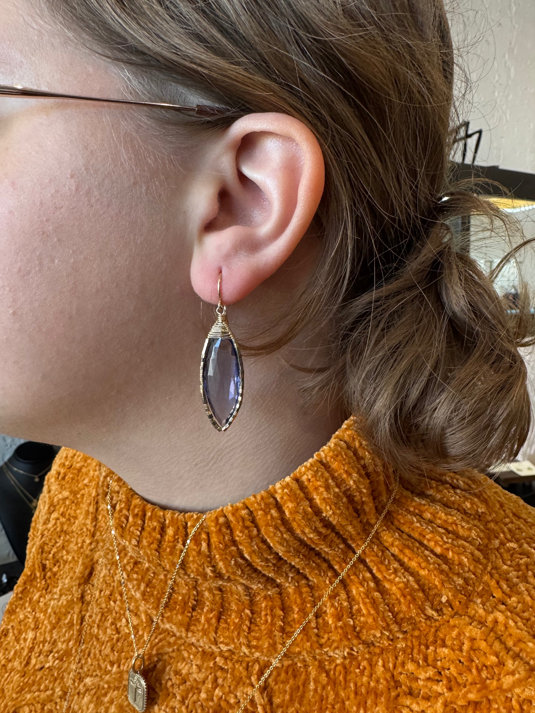 These drops by Dana Kellin look amazing with any skin tone or hair color! Each earring features a faceted, long marquise-shaped Iolite Quartz drop that features a frame of gold-filled beads. At the top of the earring is gorgeous gold-filled wire wrapping, a technique that Dana Kellin is known for.