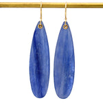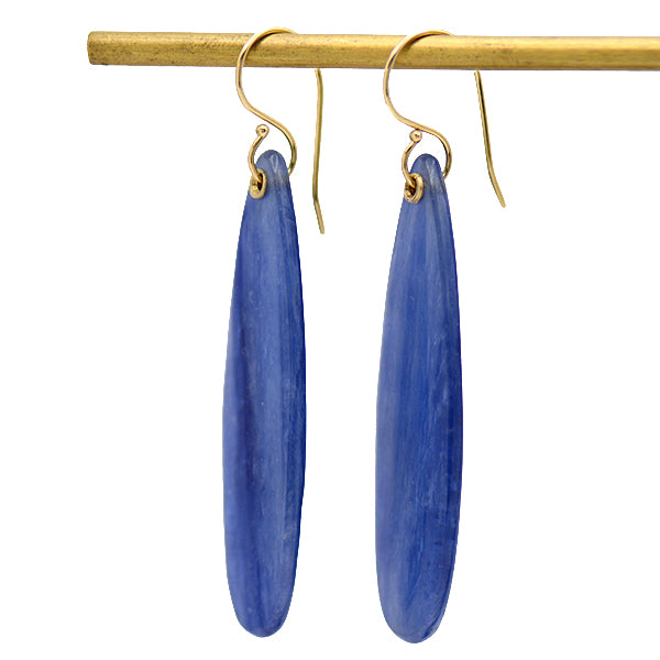 We've fallen in love with these one-of-a-kind Jamie Joseph drops! Each features an elongated smooth Kyanite stone that is drilled through to hang directly from 14k Yellow Gold shepherds hooks. The drilled hole is rimmed in gold to protect the stone and allow them to move smoothly as you do. A truly exquisite color and design!