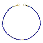 Dark blue, round, faceted Lapis beads come together to form this gorgeous Margaret Solow bracelet! The stones are accented by a single 23k Yellow Gold tubular bead at the center, which brings the perfect warm touch! Finished off with a 18k Yellow Gold lobster clasp.