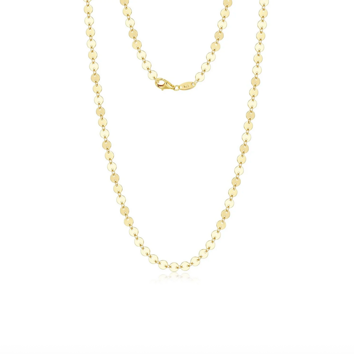 Lola doesn't whisper, she shimmers! Featuring radiant, mirror-like discs that dance with the light, the Lola Disc Chain is bold, playful, and effortlessly chic. Crafted from sterling silver plated with gold, this statement piece brings a touch of glam to any look. Measuring 18 inches in length and finished with a secure lobster clasp.