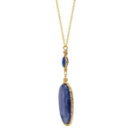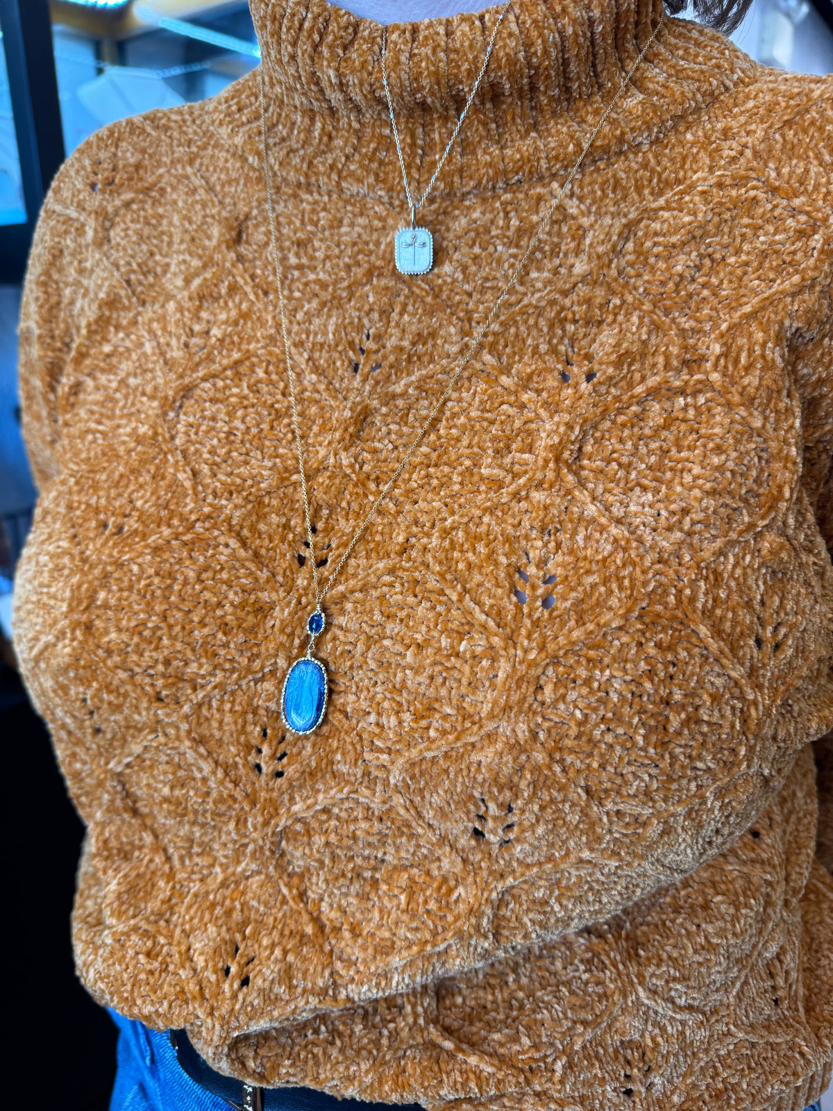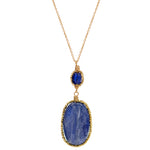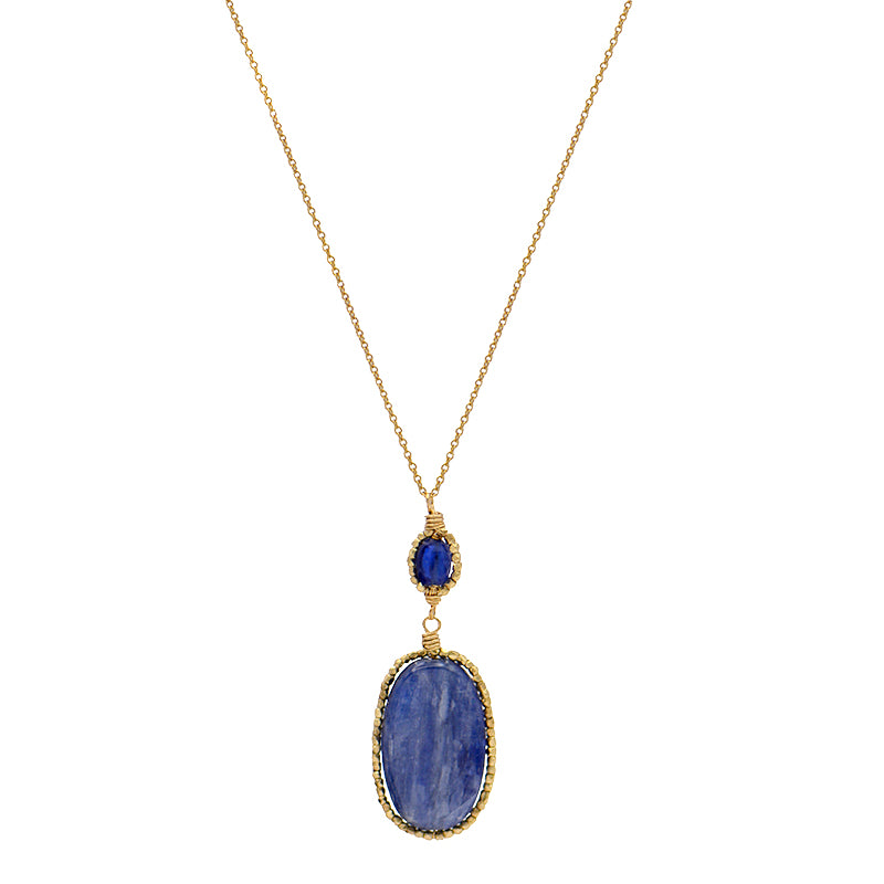 A double-style pendant necklace by Dana Kellin that we're obsessed with! A unique oval-shaped smooth Kyanite stone is framed in gold-filled beads, wire-wrapped by hand around the stone. Moving up the piece is another, smaller, darker, faceted Kyanite stone is the same style frame. The pendant hangs from a long gold-filled cable chain. We love it alone or layered with your other favorite pieces!