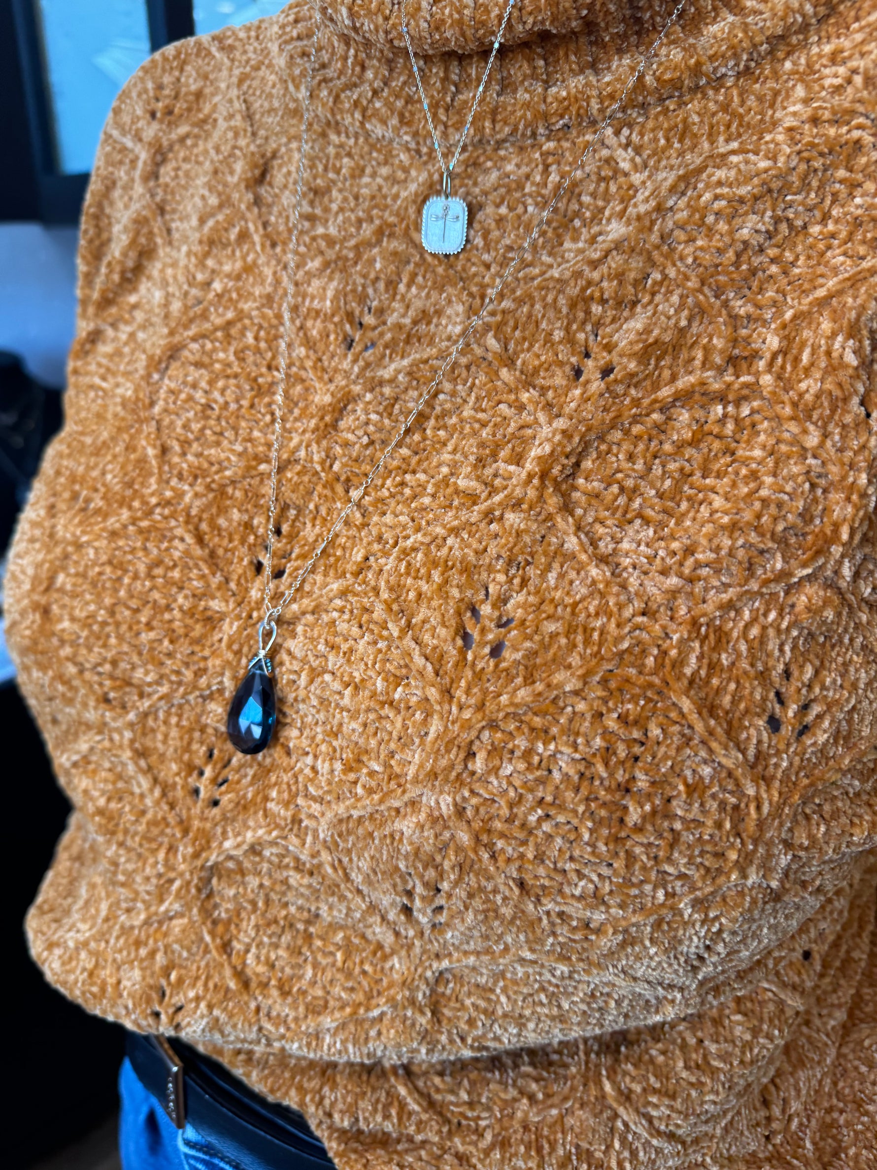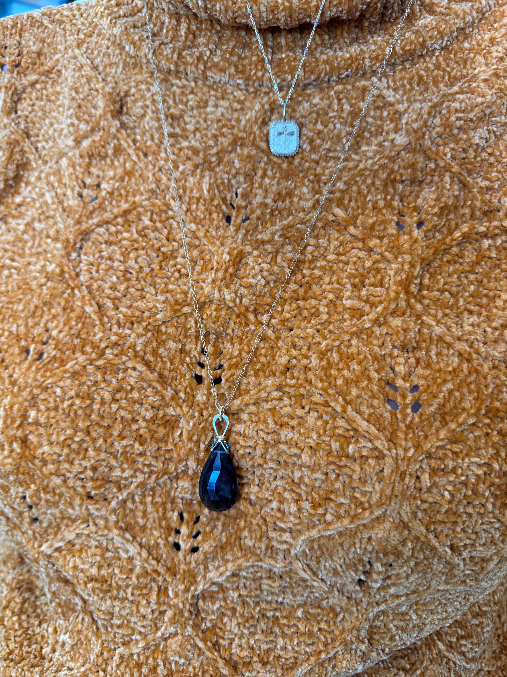 A new favorite long necklace! Dana Kellin crafted this piece with a captivating pear-shaped London Blue Quartz faceted to show off some amazing fire! The stone features small blue beaded details along the top and a unique gold-filled bail. Experience the gorgeous, meticulous detailing of Dana's wire-wrapping on each side of the bail! Hanging from an open-link, long chain...we LOVE it!
