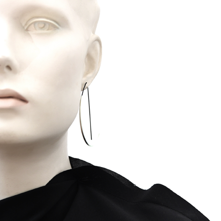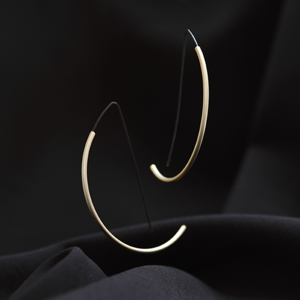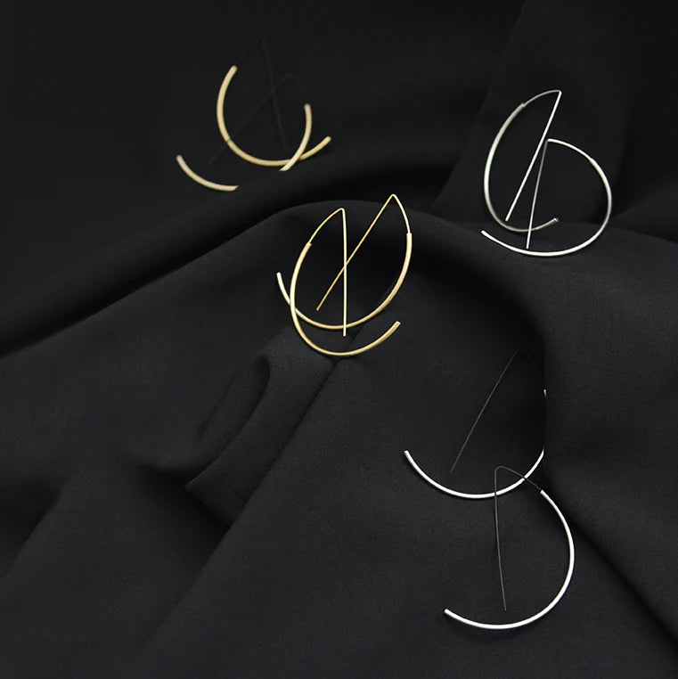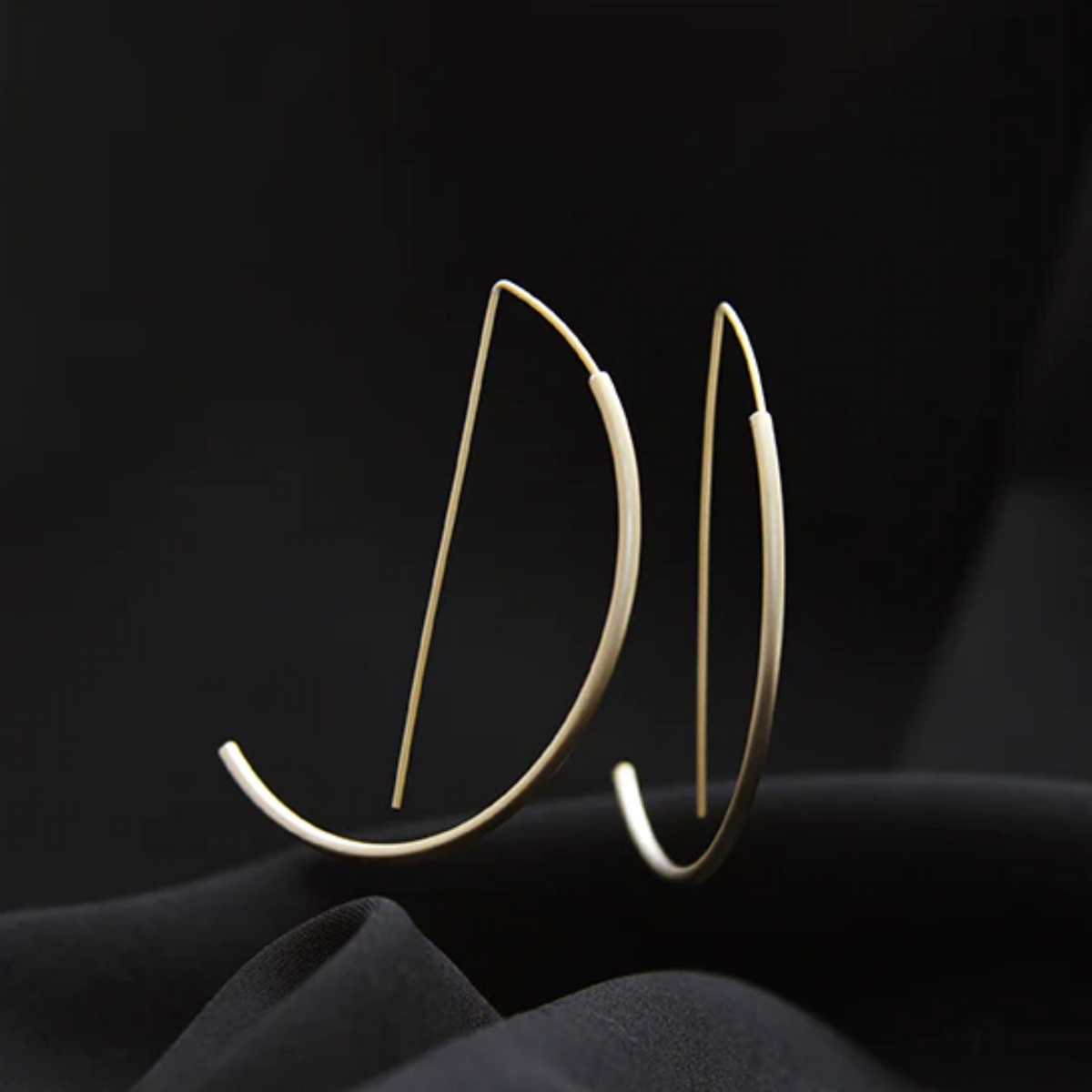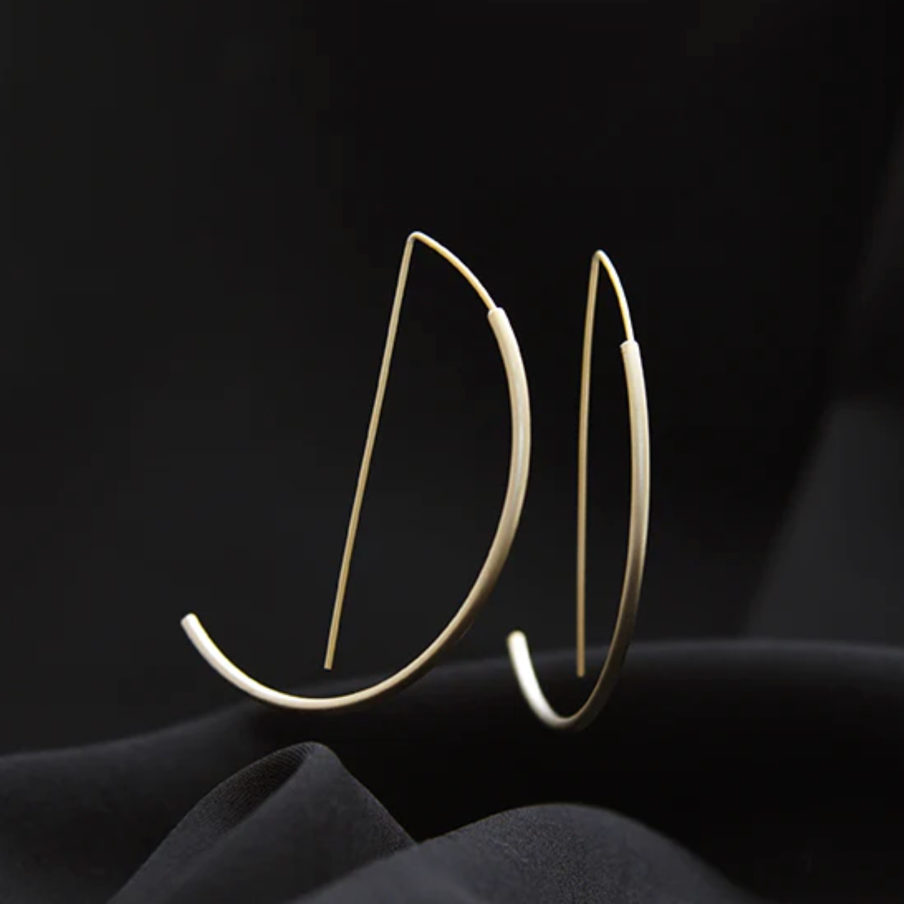 These threader hoops from Pursuits are some of our favorites! A silver-toned Rhodium with a blackened Zinc post OR a 12k yellow gold half-circle with a satin finish each lead up to a 90-degree angle that slides easily through the ear. The slender but bold rounded hoops hang directly through the ear lobe to create a sleek yet dramatic look!