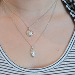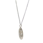 From Kristin Novinger's new engraved collection, this 14k White Gold pendant features a domed oval shape with sections distinguished by raised dividing lines featuring a single flush-set round Diamond in each. A hand-engraved pattern draws your focus to the central bezel-set diamond and gives a unique look to the piece! Hangs from a classic high-polished bail on a cable chain.