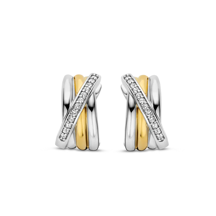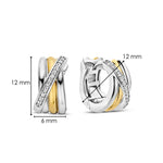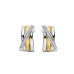 These huggie hoops by TI SENTO- Milano are thick enough to make a statement but small enough to wear all day long! A pair of Sterling Silver hoops features vertical bands of gold plating along the front with a single strip of Sterling Silver set with Zirconia stones that passes diagonally across the front. With a hinged bottom, they're so easy to put on and rock with your favorite outfit!