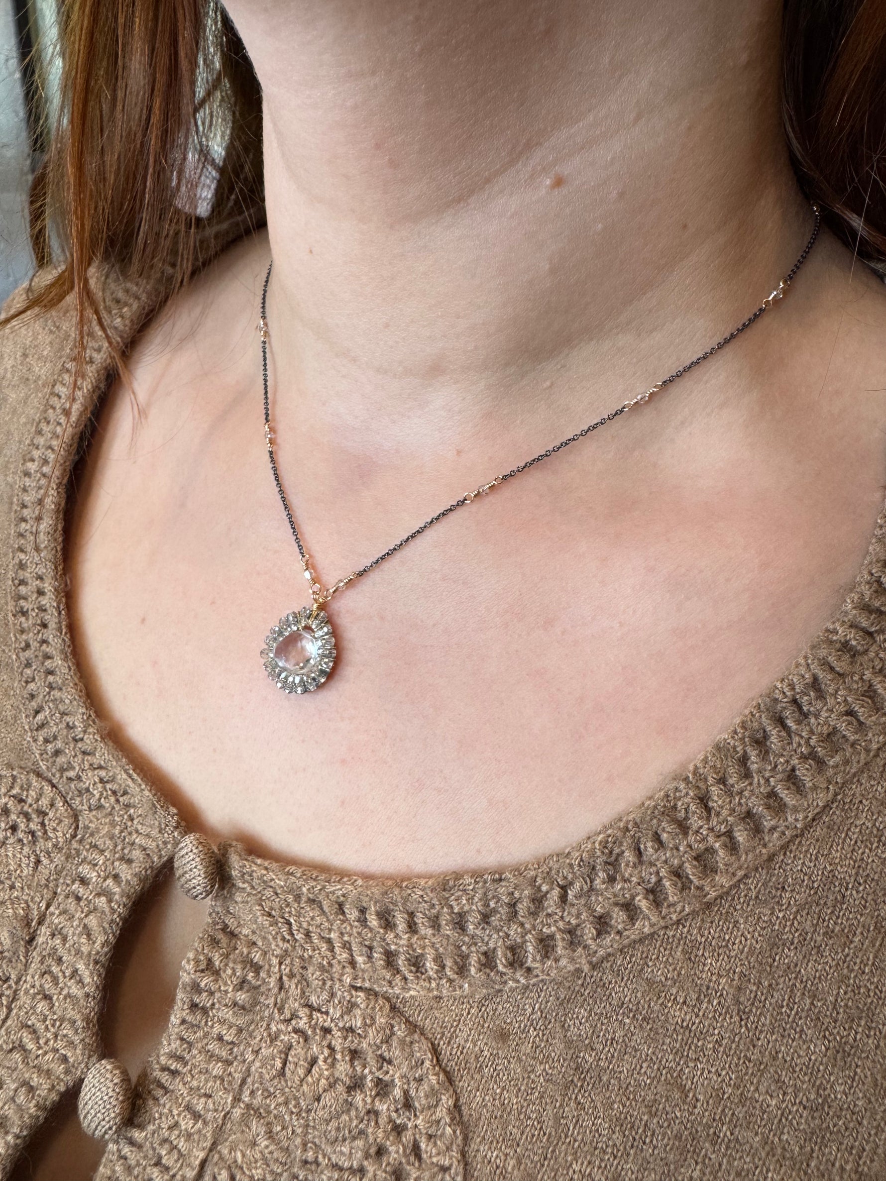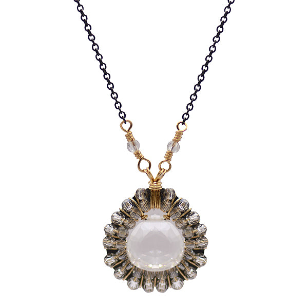 A clear, faceted crystal with a pear-shaped cut is at the center of this Dana Kellin pendant. The crystal is framed by clear Quartz beads, wire wrapped by hand onto the piece. An oxidized sterling silver chain meets the pendant with a section of 14k yellow gold filled metal for a gorgeous mixed-metal look!