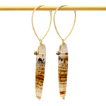 The stunning characteristics of the Montana Agate stones will have you falling in love with these earrings! Part of Dana Kellin's "Fine" collection, these one-of-a-kind earrings each feature a long, pointed Montana Agate drop that hangs from a 14k Yellow Gold flexible hoop earring. A single Black Diamond is added to each for a special design touch! Gorgeous.