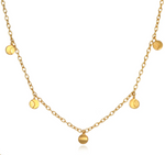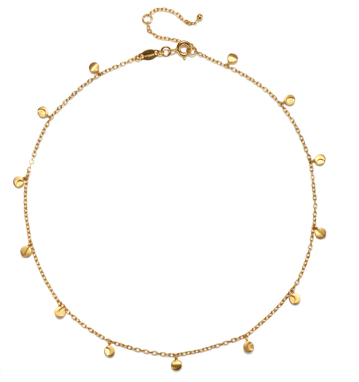 As the goddess moon guides the tides to ebb and flow, we are reminded of when to nurture and when to let go. Delicate moon charms dangle from this 18kt gold plate choker necklace, reflecting the phases of the moon - a celebration of feminine energy and growth.