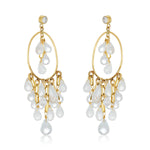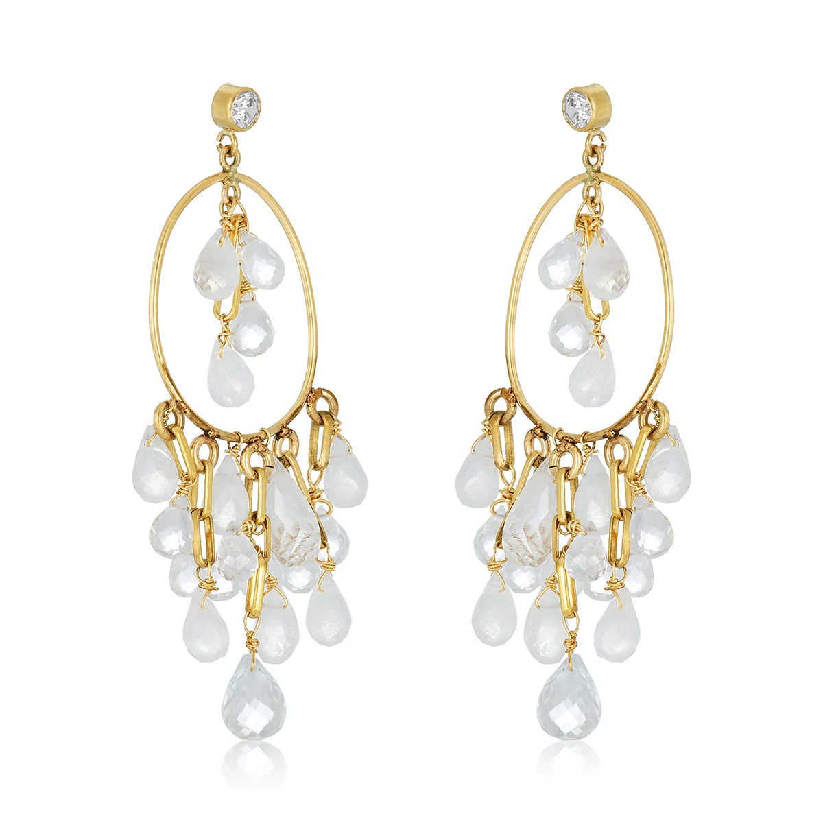 14k Yellow Gold-Filled open oval shapes are accented with pear-shaped Moonstone custers hanging in the center. The base of the oval is adorned with more Moonstone briolettes, giving a classic chandelier earring effect. All hanging from post backings with a single Cubic Ziconia set on the front, we love these!