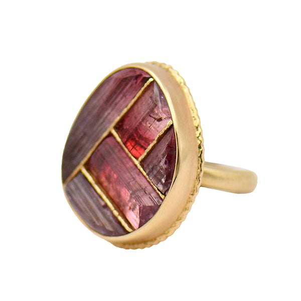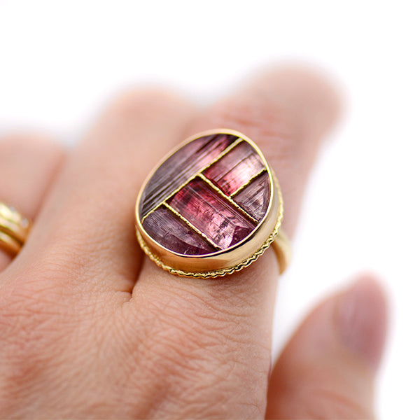 Jamie Joseph has done it again!! We're OBSESSED with this ring. Surface cut Pink and Purple Tourmalines are set in 14k Yellow Gold and feature Jamie Joseph's mosaic grouting - leaving lines of gold between each stone. The ring is accented by a ruffled gold platform and a satin finished with a 14k Yellow Gold band.