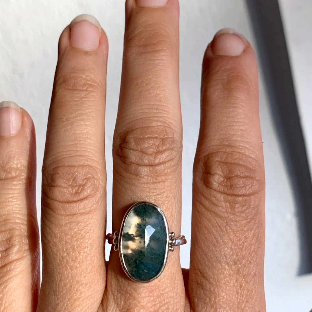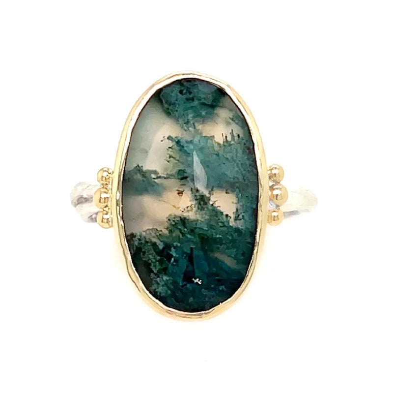 This one-of-a-kind Emily Amey ring has such unique characteristics, you'll never see another like it! An oval-shaped Moss Agate is framed in 14k Yellow Gold with 3 gold bead accents on each side. The ring features a Sterling Siver backing and band with an organic design. Gorgeous!