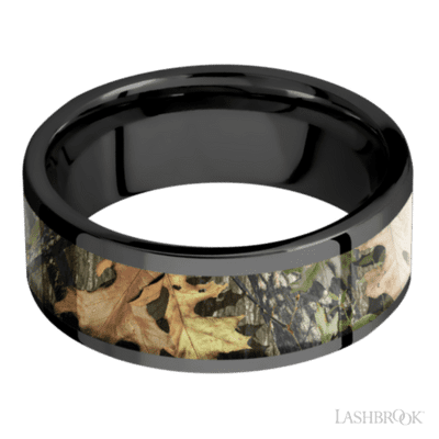A unique and trendy band by Lashbrook Designs! An 8mm wide flat Zirconium band features a unique inlay of a mossy oak scene! Perfect for the adventurer in your life.