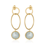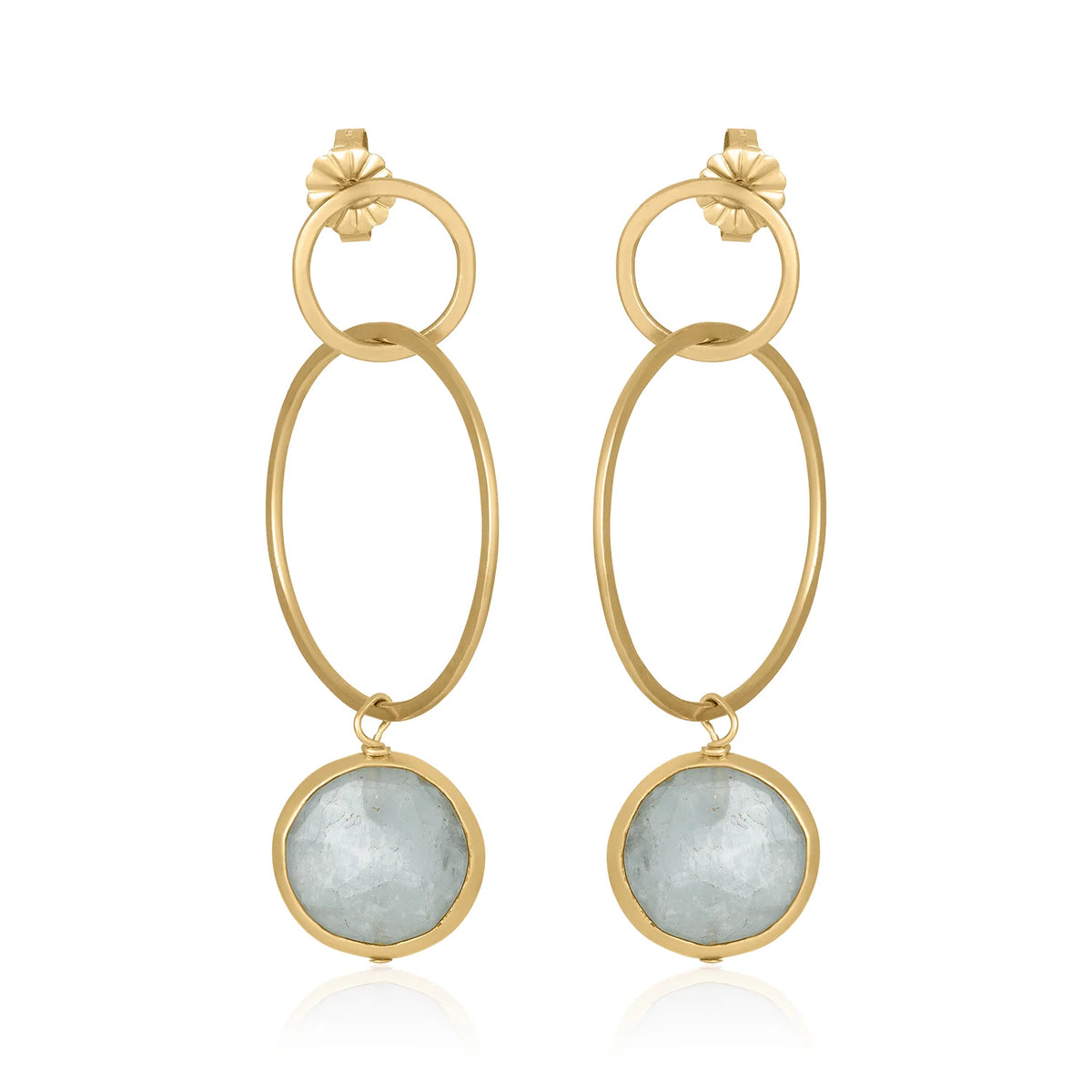 The perfect lightweight earrings to make a statement! Mabel Chong designed these earrings with multiple 14k Yellow Gold Filled hoops that connect, dropping from a classic post/nut backing. The bottom hoop on each earring is set with an Aquamarine stone. Gorgeous!