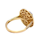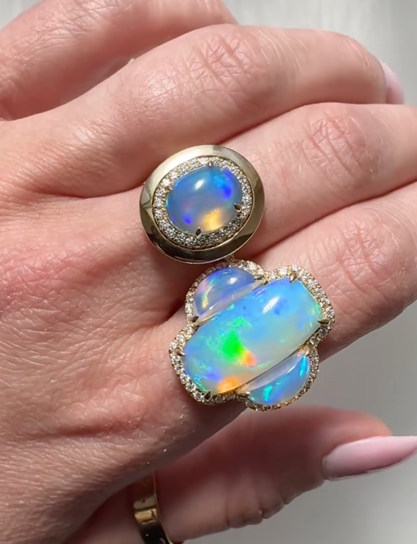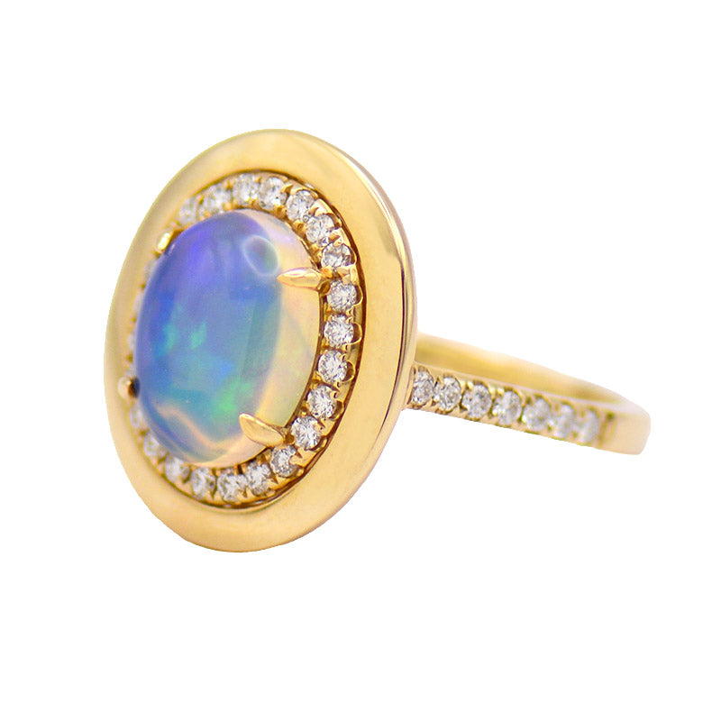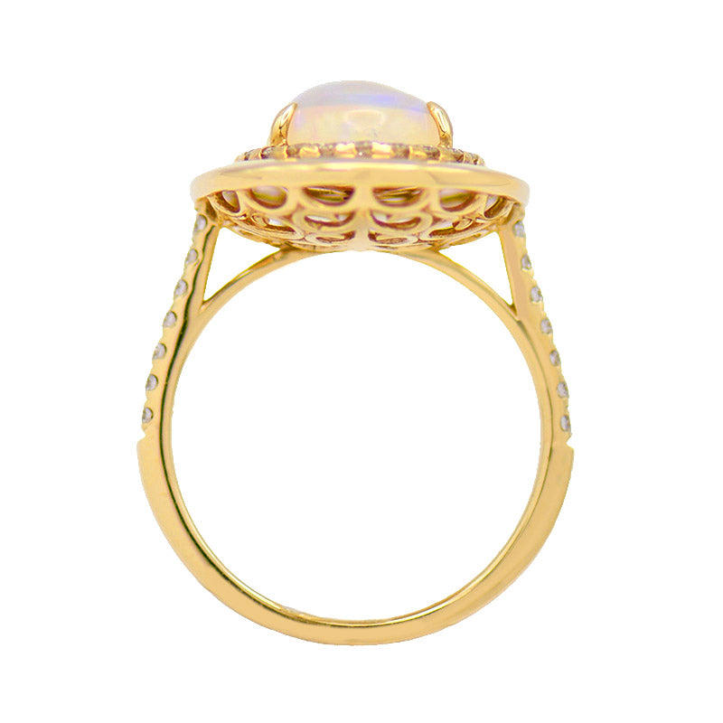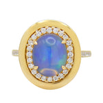 An Opal-lover's dream! This David Kord ring features a stunning natural opal-shaped Opal prong set and surrounded by a halo of round white Diamonds that continue onto the band. On the outer edge of the halo is a high-polished bezel that brings an incredibly unique look to the ring! Crafted in 18k Yellow Gold with an intricate open-style gallery underneath, this is sure to be your new favorite piece!