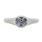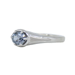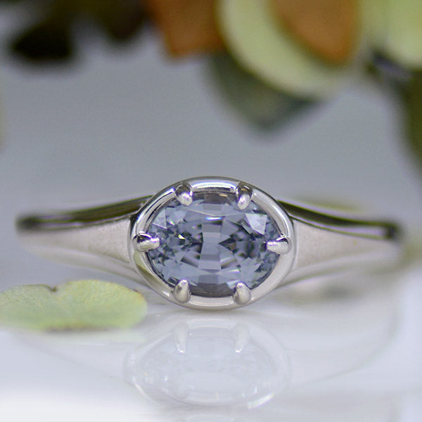 One-of-a-kind by Kristin Novinger, this ring features an oval-shaped grey Spinel set horizontally in a 6-prong setting. The stone is set on a tapered 14k White Gold band that features a raised v-shape design adorned with a satin finish. A unique piece that shows off the stunning versatile hues and impressive sparkle of Spinel!