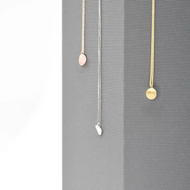 Pursuits creates this necklace in all 3 metals, making it perfect for anyone! Avialable in Stelring Silver, Yellow Gold Plating, or Rose Gold Plating, each necklace features a small curved circle pendant with a satin finish that hangs from a box-style chain.