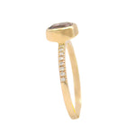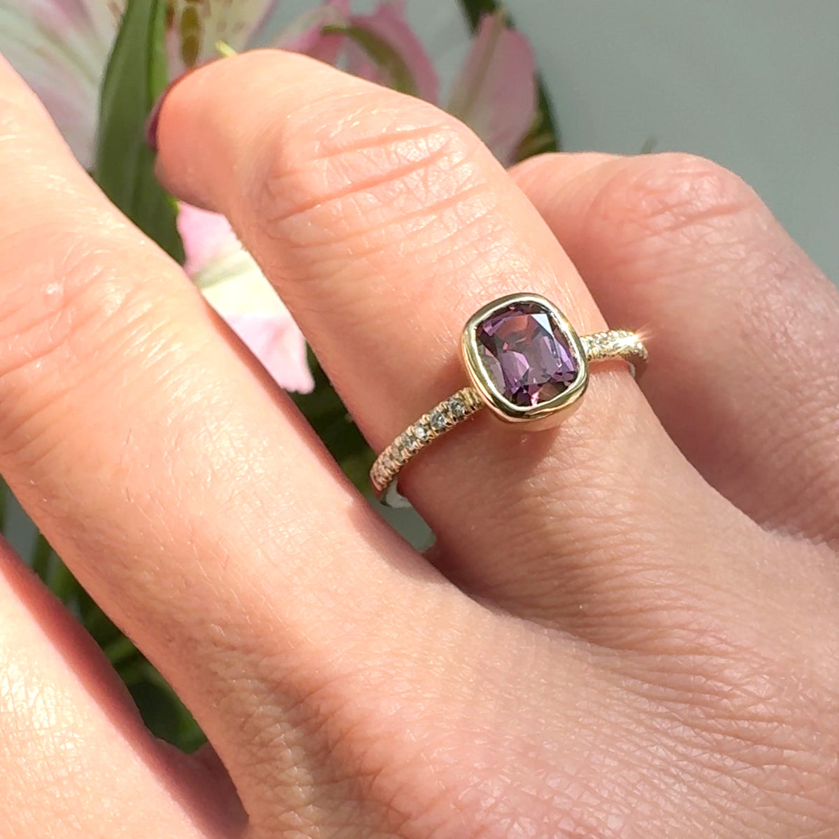 This one-of-a-kind ring by Kristin Novinger will take your breath away! Crafted in 14k Yellow Gold, the ring features an exquisite faceted Purple Spinel bezel set on a low-dome band for maximum comfort. The band is pavé set with round diamonds that lead halfway down. Wait until you see the unqiue hues and gorgeous sparkle!
