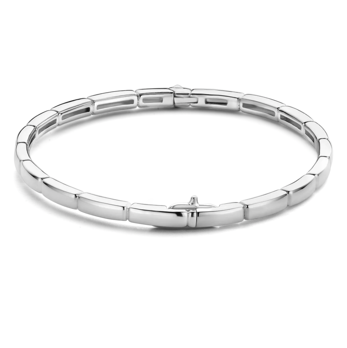 This TI SENTO - Milano silver bracelet is crafted from Sterling Silver and coated with a thick layer of Rhodium to protect it and keep it luminous! The bangle-style bracelet is adorned with rectangular stations and features a hidden closure for easy wear. This fundamental silver piece is a timeless classic that can be stacked or worn alone for a sophisticated look!
