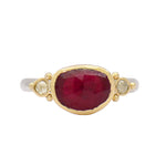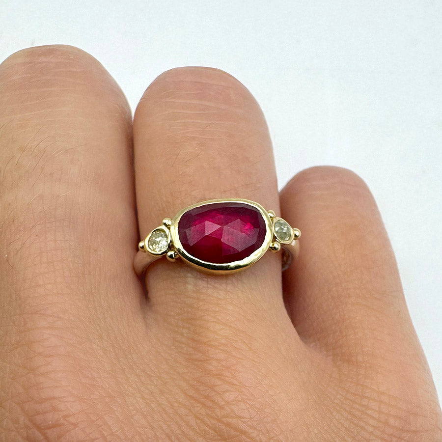 A Ruby Ring that will have you swooning! Emily Amey handcrafted this ring around an east/west set faceted oval Ruby bezel-set in 14k Yellow Gold. The stone is accented on each side by a bezel-set round rose-cut diamond with gold bead detailing. On an organic Sterling Silver band, this piece will be your new favorite!