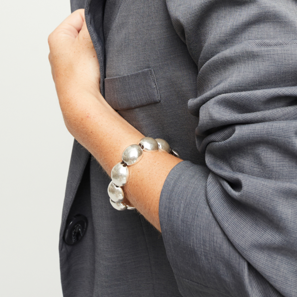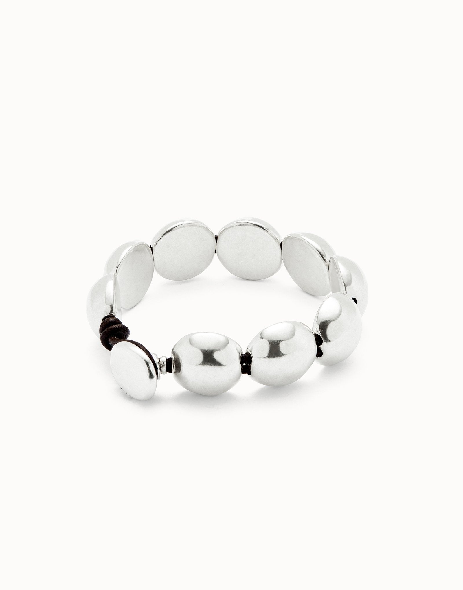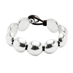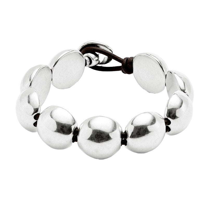9 large round silver-plated metal beads are strung onto UNOde50's signature dark brown leather cord with a classic loop/button closure. The beads are each made with a flat backing to allow them to lay comfortably on the wrist. Wear it alone or with your other favorite pieces!