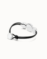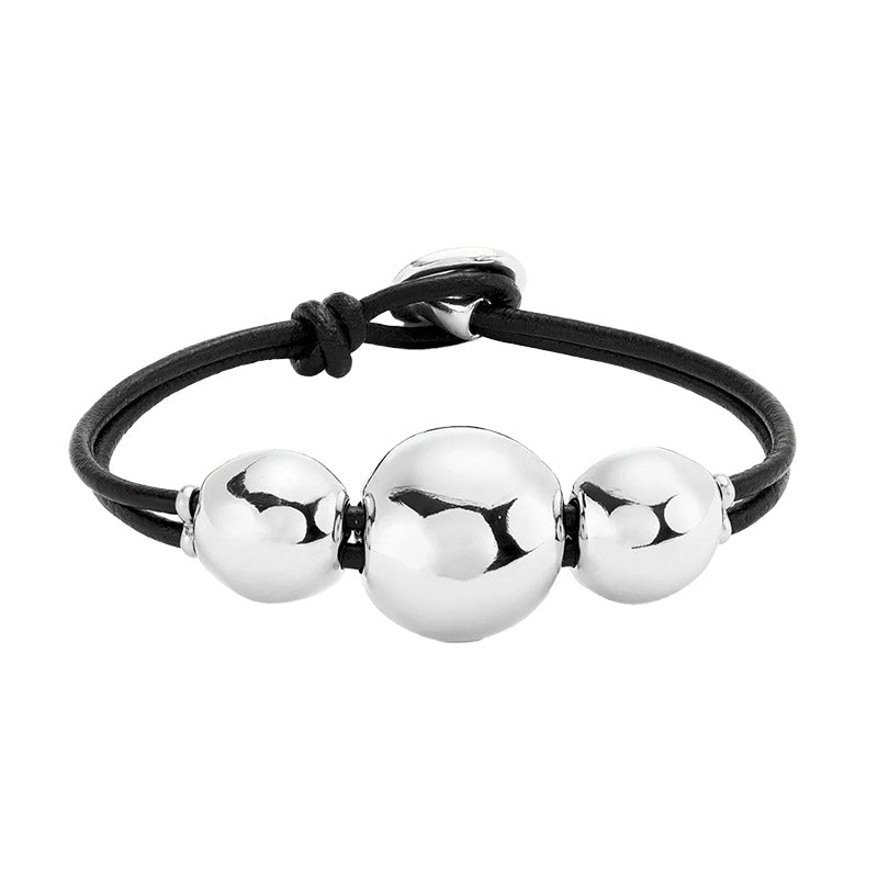 Three smooth silver or gold plated metal beads, the largest in the center, sit stationary in the center of a double-style dark brown leather cord bracelet. The bracelet features a classic loop/button closure for secure, all-day wear! 100% handcrafted in Spain.