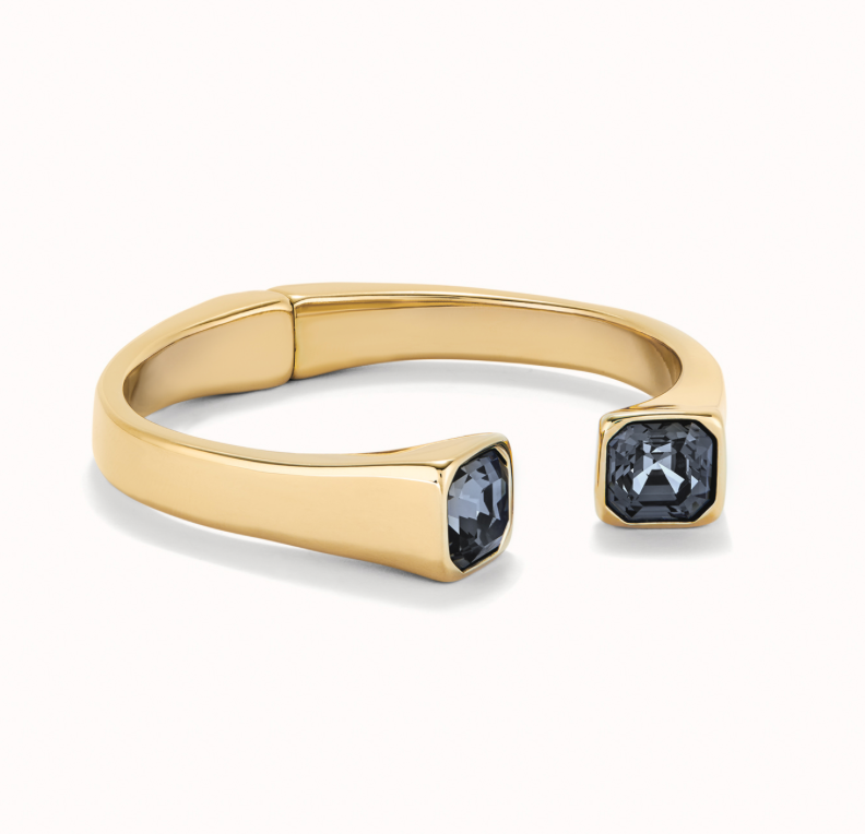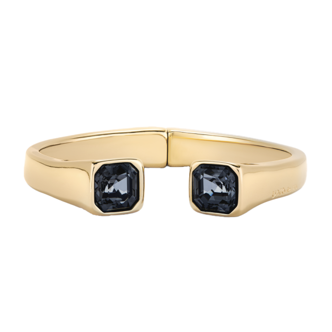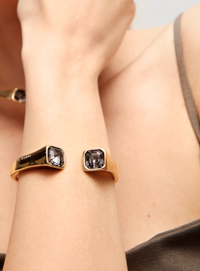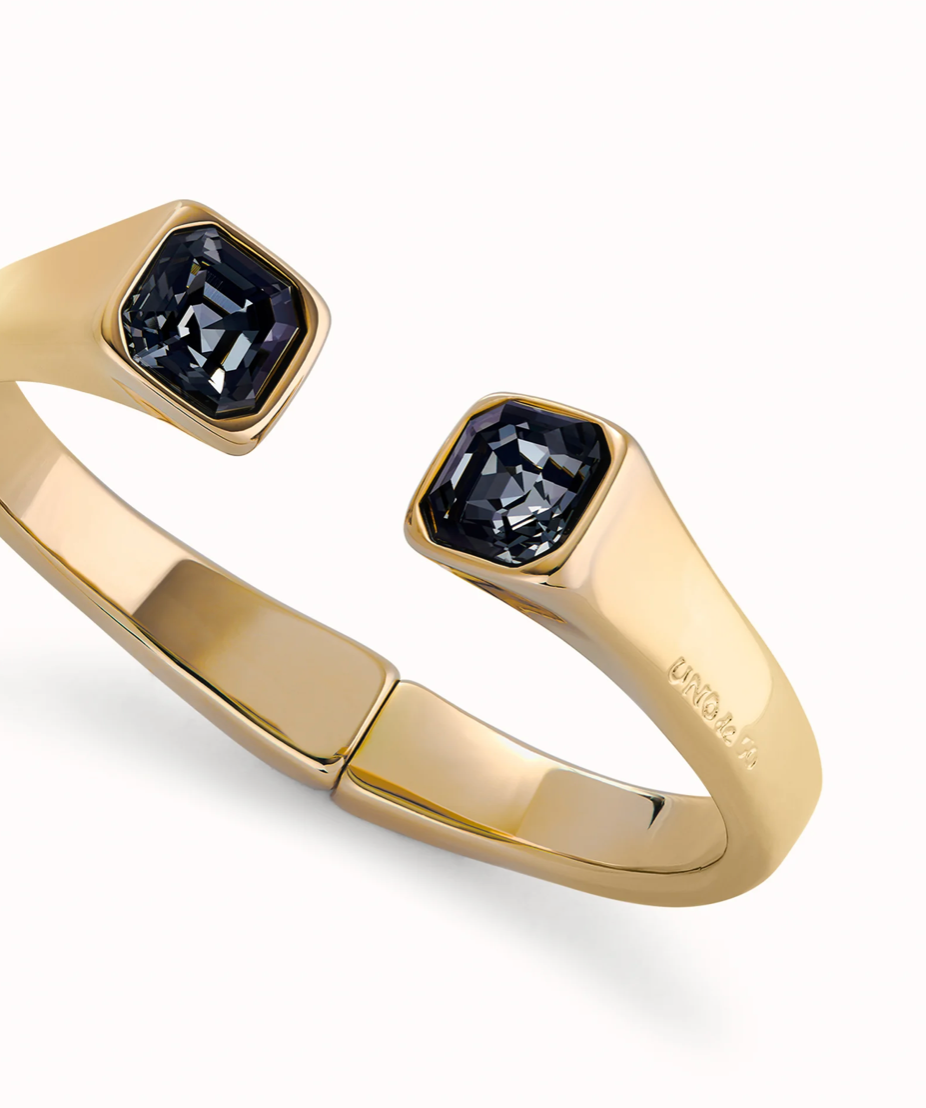 A unqiue gold-plated metal bracelet by UNOde50! A hinged cuff meets at the top with an open-style design featuring a faceted dark grey crystal on each side. Unique, comfortable, and 100% handcrafted in Spain.