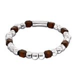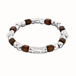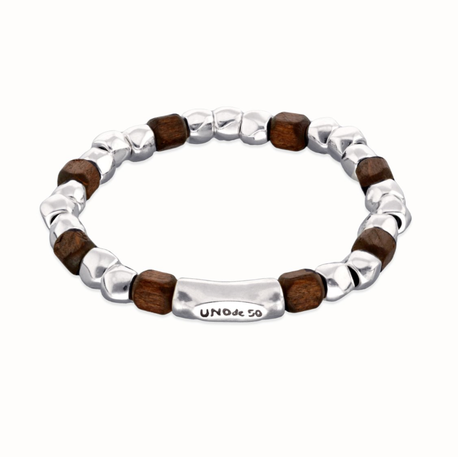 An eye-catching UNOde50 bracelet with gorgeous contrast! Silver plated and brown wooden beads are strung onto UNO's signature elastic cord with a central tube bead engraved with their logo. 100% handcrafted in Spain.