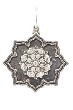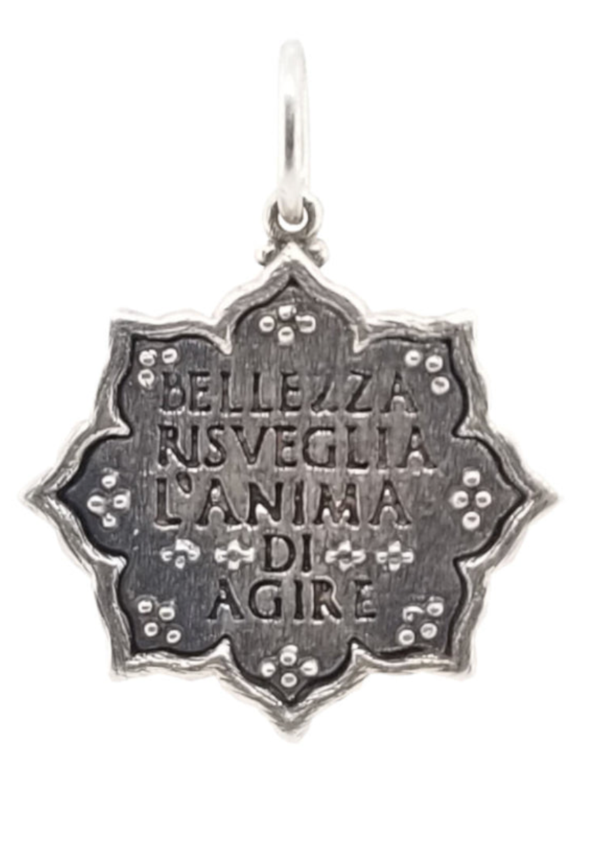 One of our most unique charms from the iconic Erica Molinari collection! A pointed lotus design features a flower set with round diamonds on one side while the other reads "Bellezza Risveglia L'anima Di Agire" meaning "Beauty Awakens The Soul To Act." The quote side of the charm is adorned with Sterling Silver circular design elements to bring an even more intricate look to the charm. Wear it on your favorite chain or contact us to purchase a new one!