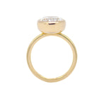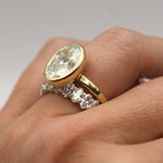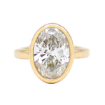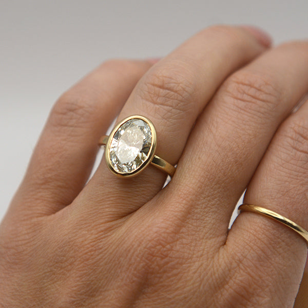 An exquisite oval ring by Ava Couture that is sure to blow you away! A lab-grown oval Diamond is bezel-set on a classic 14k Yellow Gold band. The ring was designed to perfectly fit a band flush against it, so we love it as an impressive engagement ring...but it's a perfect rignt hand ring for our fellow big diamond lovers! Gorgeous!