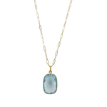 A rectangular faceted Swiss Blue Topaz is framed in a thin piece of yellow Vermeil, allowing the light to pass through the stone beautifully as you move! The stone pendant hangs from an open-link Vermeil chain. Perfect with any outfit!