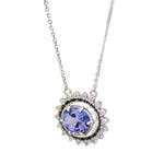 Kristin Novinger has created the most gorgeous Tanzanite & Diamond necklace! This one-of-a-kind piece features an oval-shaped Tanzanite, set horizontally, and accented by a low-dome style bezel that leads to a halo of round white Diamonds. The halo is set slightly spaced from the bezel, leaving a negative space that casts a stunning shadow making the stone really POP! A genius design choice! Hanging from an adjustable diamond-cut cable chain, this 14k White Gold necklace is to die for!